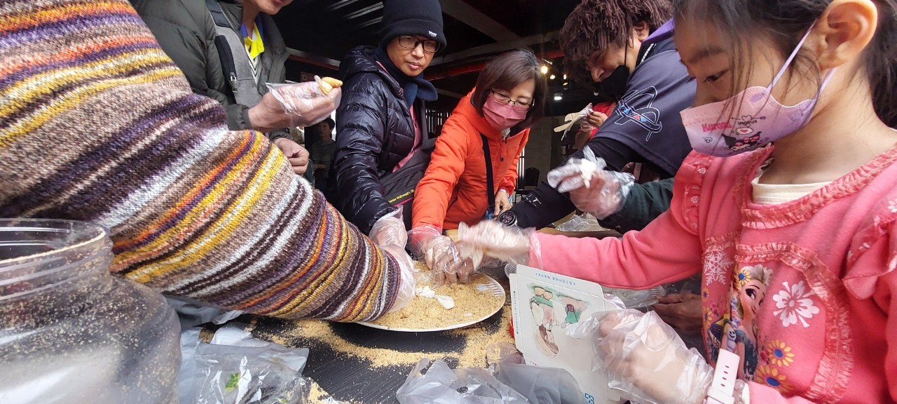 圖片說明:中央是一盤花生粉和糖粉混合的沾料,大家戴上塑膠手套,以手抓捏一塊塊麻糬,圍著盤子拿麻糬沾裹花生糖粉,吃不完的還可以裝盒外帶喔~