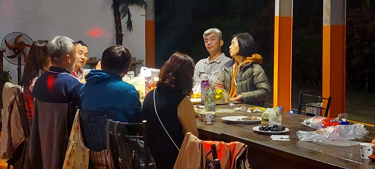 圖片說明:晚上住宿位於南投國姓鄉的梅之林度假山莊,梅之林度假山莊依山傍水,位在中央山脈緊臨北港溪。住宿的湯屋環境清幽,空間舒適。打開窗戶就是秀麗山景。晚餐後大家聚在卡拉OK區,閒聊喝茶,唱歌休閒,在春雨綿綿涼爽氣溫、北港溪潺潺流水聲、寧靜的山居風情中結束一天的行程。